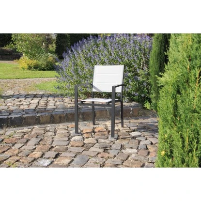 Der Stapelsessel Alberto überzeugt durch sein belastbares Gestell aus pulverbeschichtetem Aluminium und seinem Bezug aus atmungsaktivem und wetterfestem Acatex-Gewebe, das einen sehr guten Sitzkomfort auch über lange Zeit bietet. Schadstofffrei. Maße ca. 55 cm x 56 cm x 88 cm.