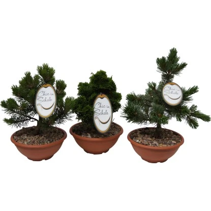Bei den Edelgehölzen „Chic in Schale“ handelt es sich um schwachwachsende, winterharte Gehölze. Diese in dekorativen Schalen gepflanzten Koniferen eignen sich hervorragend für die Gestaltung der Terrasse oder des Balkons.