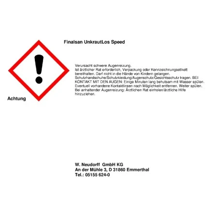 Das Finalsan Unkrautlos Speed ist ein Unkrautvernichter gegen Unkräuter, Moose und Algen. Es wirkt sichtbar in 1 Stunde und ist biologisch abbaubar (nach OECD 301 F) und hat eine hohe Umweltverträglichkeit, mit einem Wirkstoff, wie in der Natur vorkommend. Das Finalsan Unkrautlos Speed ist schonend für Haustiere, Bienen (in DE: NB 6641) und Igel. Das Konzentrat ist für die Behandlung größerer Flächen geeignet.