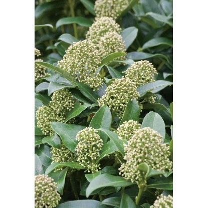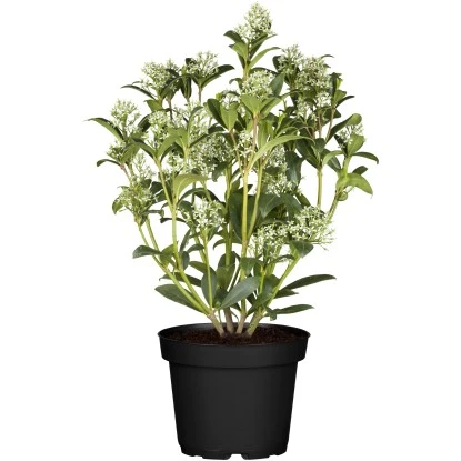Die Japanische Fruchtskimmie „Fragrant Cloud“ (Skimmia japonica) bezaubert nicht nur mit den großen Blütenrispen, die von April bis Mai in einem schönen Weiß erscheinen, sondern auch mit dem betörenden Duft nach Maiglöckchen, der von diesen Blüten ausgeht. Ab August sind es dann die großen, leuchtend roten Früchte, die einen farbenfrohen Blickfang bieten.